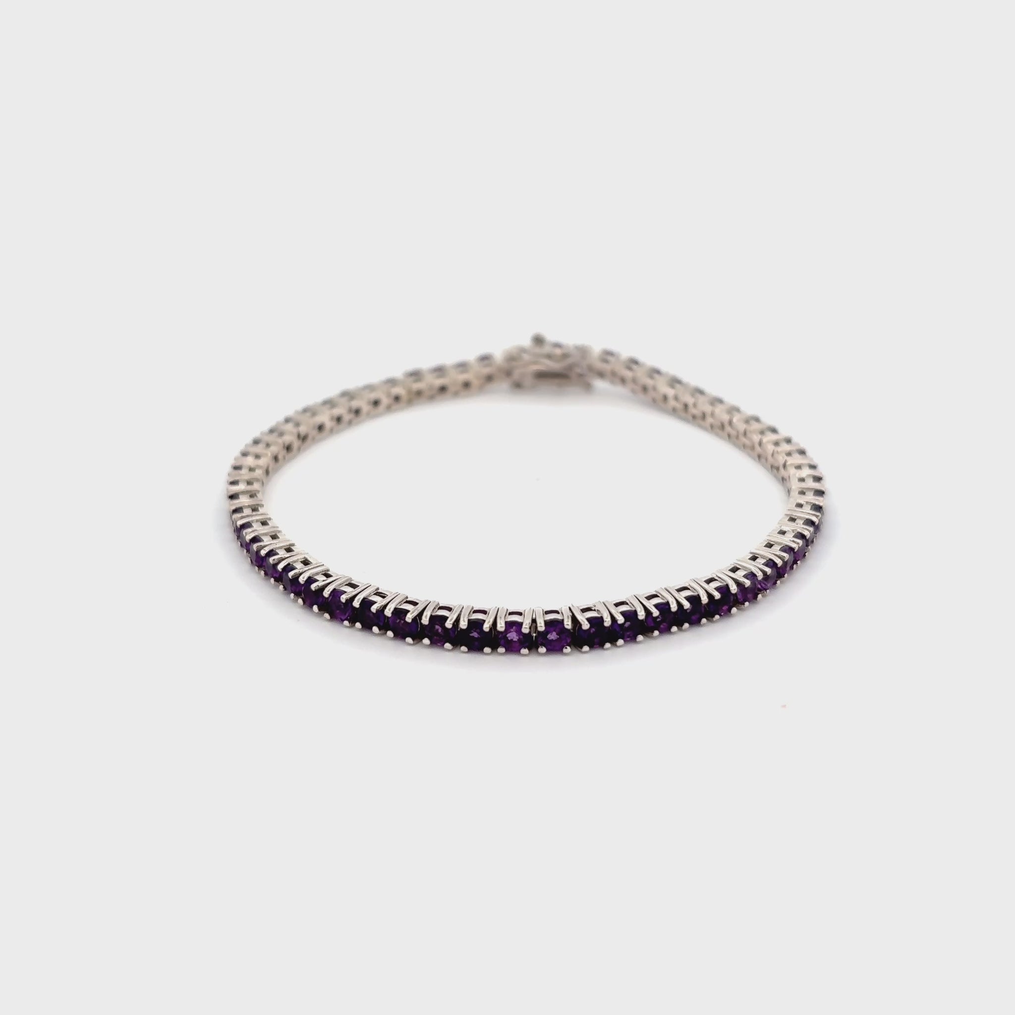 This elegant 8-inch Amethyst Tennis Bracelet features vibrant 3 mm amethyst gemstones, each precisely set in rhodium-plated sterling silver for a brilliant, tarnish-resistant finish. The rich purple hue of amethyst brings a touch of luxury and timeless beauty, while the 11.3-gram total weight and double-lock clasp ensure a secure, comfortable fit for everyday wear or special occasions.
