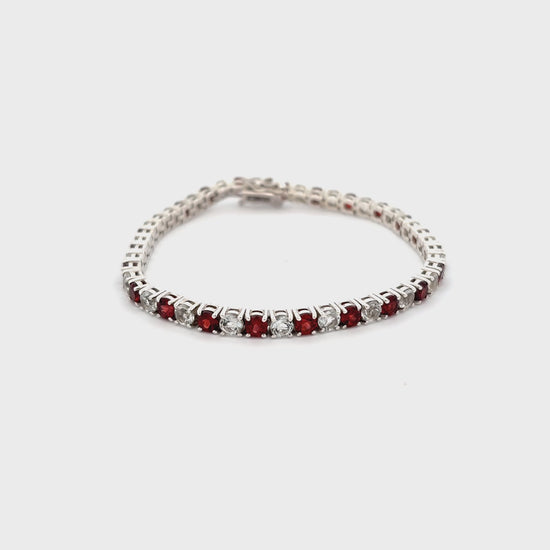 This luxurious 8-inch Garnet & Topaz Bracelet features alternating deep red garnets and icy blue topaz gemstones, each precisely cut at 3.8 mm. The stones are handset in rhodium-plated sterling silver for long-lasting shine and durability. The braceletβs 16.2-gram total weight provides a solid, premium feel, while the double-lock clasp ensures secure and comfortable wear.